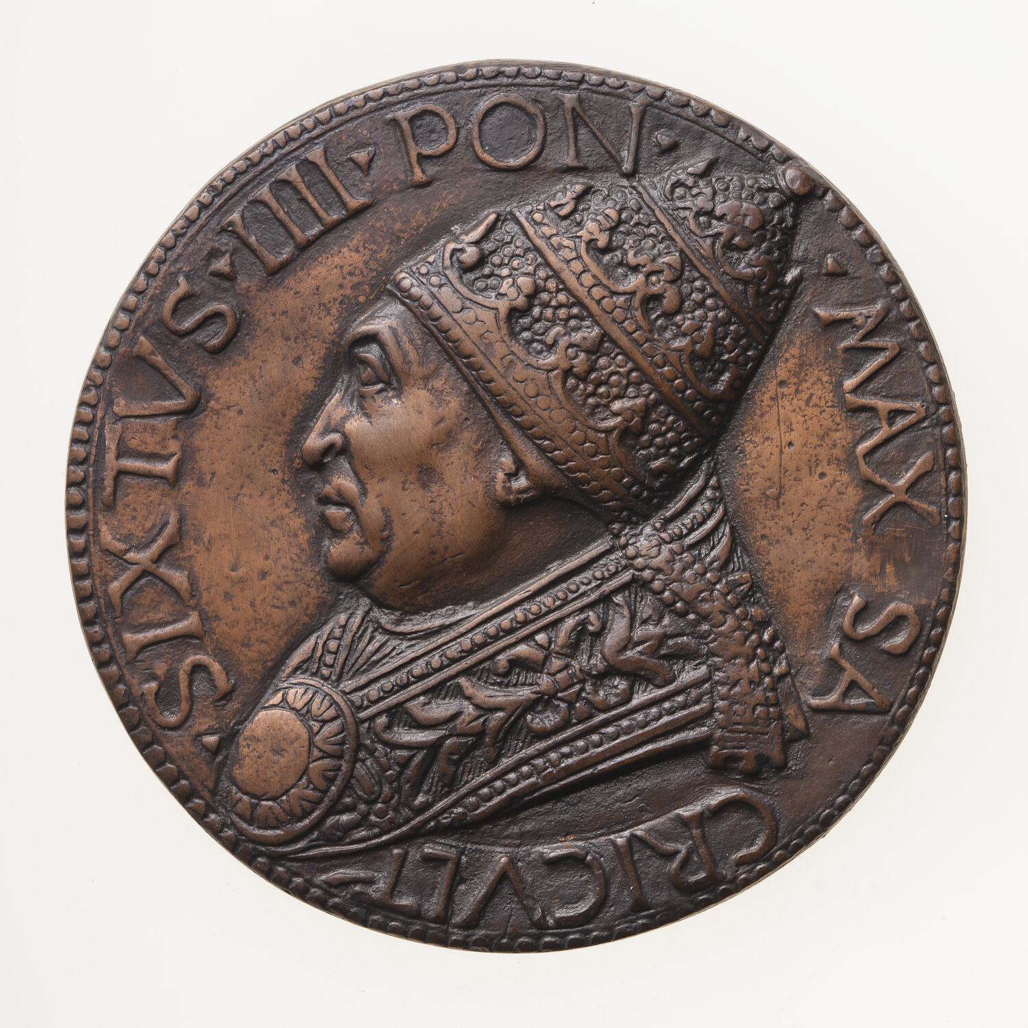 Copy of a medal of Pope Sixtus IV (1471-1484). The original medal, by an unknown artist, was made in 1481. This Electrotype copy made circa 1881 by Robert Ready. The original medal from the collection of George III (Reg: G3,PMAE3.2) was exhibited in the King's Library of the British Museum in 1881 and is No. 311 in the catalogue of that exhibition. It is thought that this electrotype was produced in association with that exhibition and publication and acquired by the National Gallery of Victoria where it was displayed in the late 1880s. The original medal is cast bronze gilt the electrotype copper plated and toned.