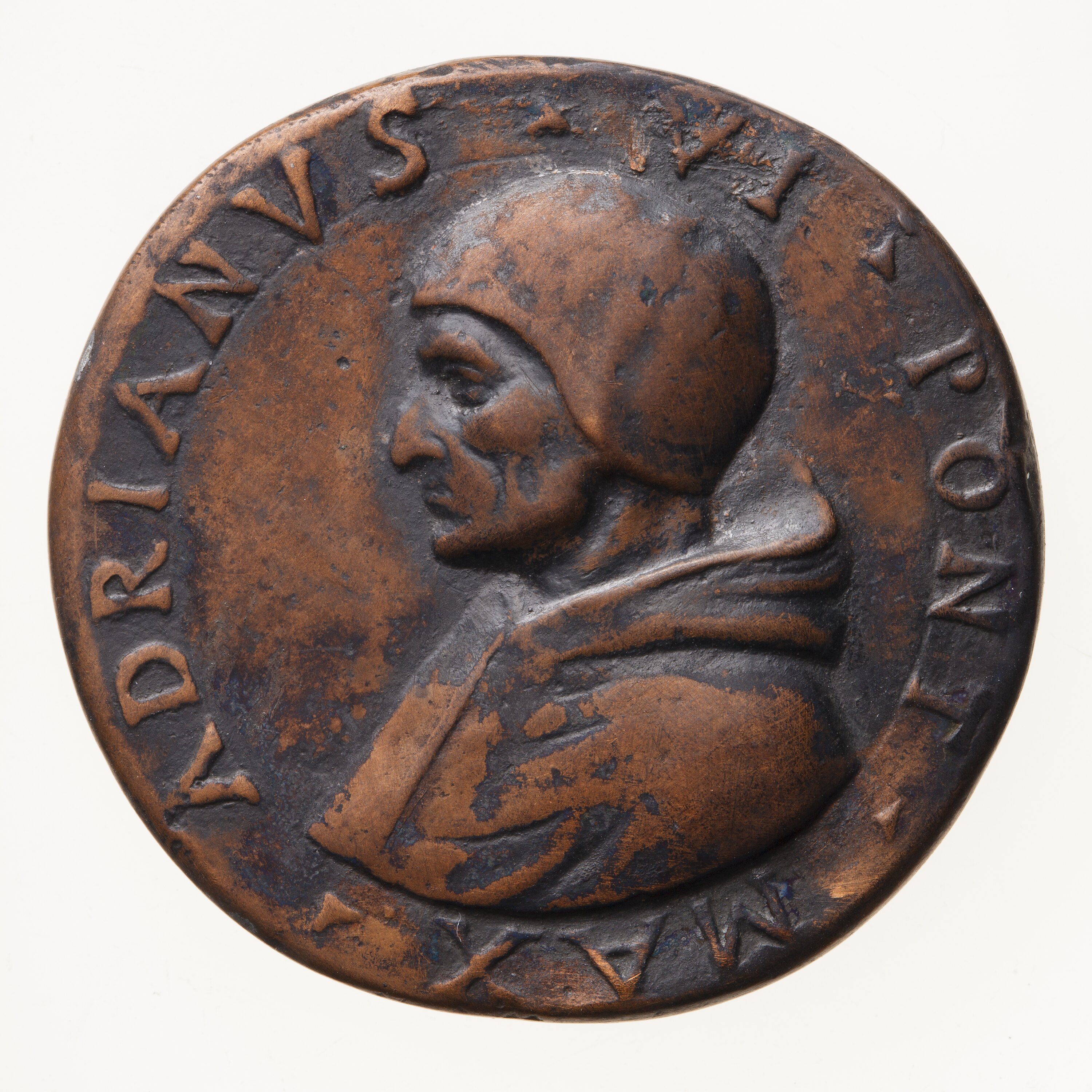 Bust of Adrian VII facing left in cape and skull-cap; around, ADRIANVS . VI . PONT . MAX .