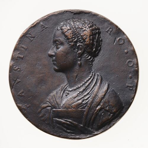 Copy of a medal of Faustina Romana (or of Rome). The original medal, attributed to Antonio Abondi, was made in about 1555. This Electrotype copy made circa 1881 by Robert Ready. The original medal was exhibited in the King's Library of the British Museum in 1881 and is No. 302 in the catalogue of that exhibition. It is thought that this electrotype was produced in association with that exhibition and publication and acquired by the National Gallery of Victoria where it was displayed in the late 1880s. The original medal is cast lead the electrotype copper plated and toned.
