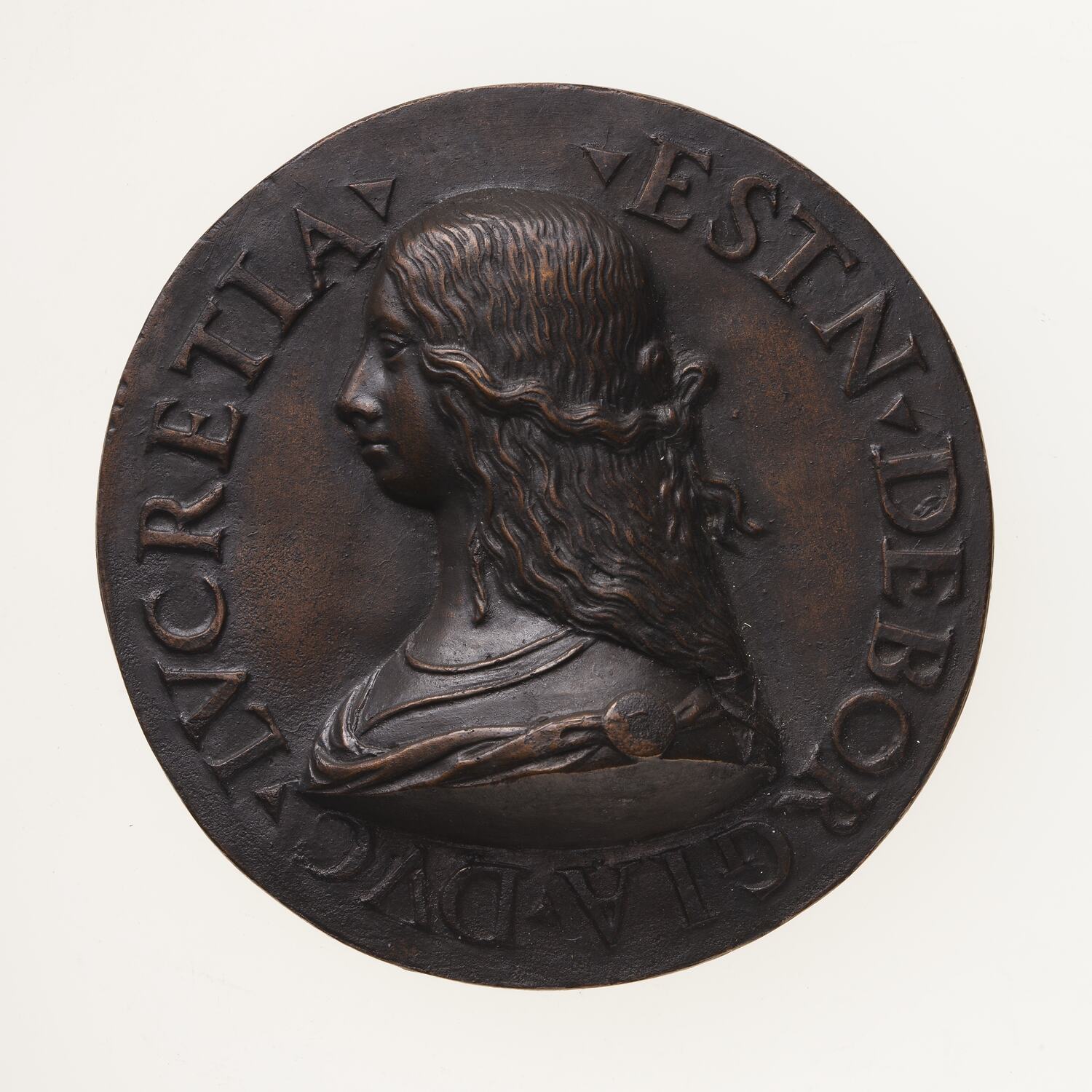 Copy of a medal of Lucrezia Borgia. The original medal, by an unknown Mantuan artist, is believed to be associated with her marriage in 1502. This uniface electrotype copy was made circa 1881 Robert Ready. This electrotype may be derived from the reverse of the British Museum piece G3,FerrM.56, from the collection of George III although the National Gallery of Art, Washington holds a uniface example (Kress.79)
