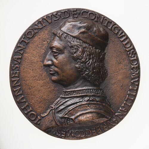 Copy of a medal of Giovanni Antonio de Conti Guides ( c.1459-1501) Count of Modigliana and Urbecche. The original medal, by an unknown artist, was cast in about 1500. This Electrotype copy in two halves made circa 1881 by Robert Ready. This electrotype was not part of the British Museum's King's Gallery Exhibition of 1881. It's acquisition by the National Gallery of Victoria and thus Museum Victoria is yet to be traced.
