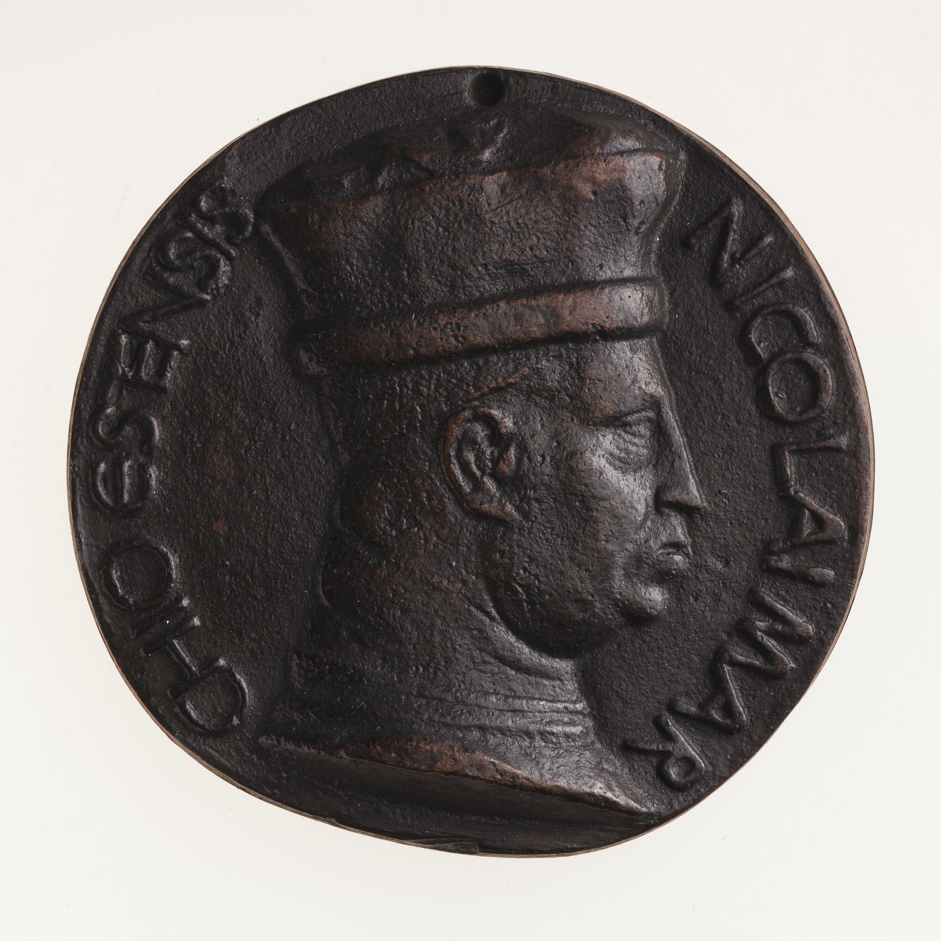 Bust of Niccolo facing right wearing soft cap; around, NICOLAI MARCHIO ESTENSIS