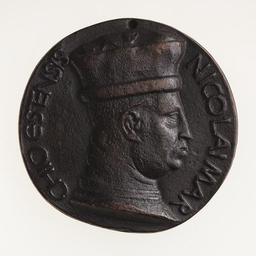 Copy of the obverse (uniface) of a medal of Niccolò III d'Este (1383-1441), Marquess of Ferrara. The original medal was by Amadio da Milano in about 1420. This Electrotype copy of the obverse was made circa 1881 by Robert Ready. This electrotype may be from the piece in the collection of George III, now British Museum Reg: G3,FerrM.21.