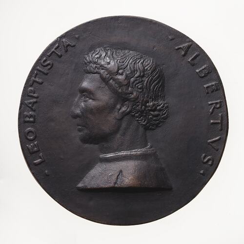 Copy of a medal of Leone Battista Albert (1404-1472) an architect and writer. The original medal was by the artist Matteo de' Pasti at Verona between 1446 and 1450. This two piece electrotype copy was made circa 1881 Robert Ready. This electrotype was not part of the British Museum's King's Gallery Exhibition of 1881. It's acquisition by the National Gallery of Victoria and thus Museum Victoria is yet to be traced. The original medal from which this electrotype was made is cast bronze, British Museum Reg: G3,IP.1. This electrotype in copper plated and toned.