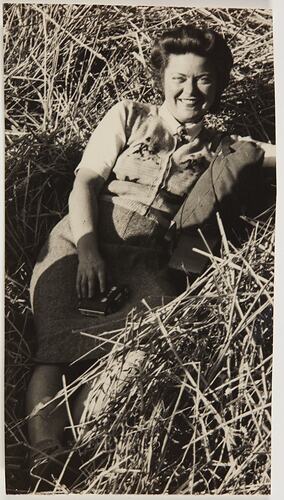 Photograph of Esma Banner holding a camera and sitting in what appears to be a bundle of hay.