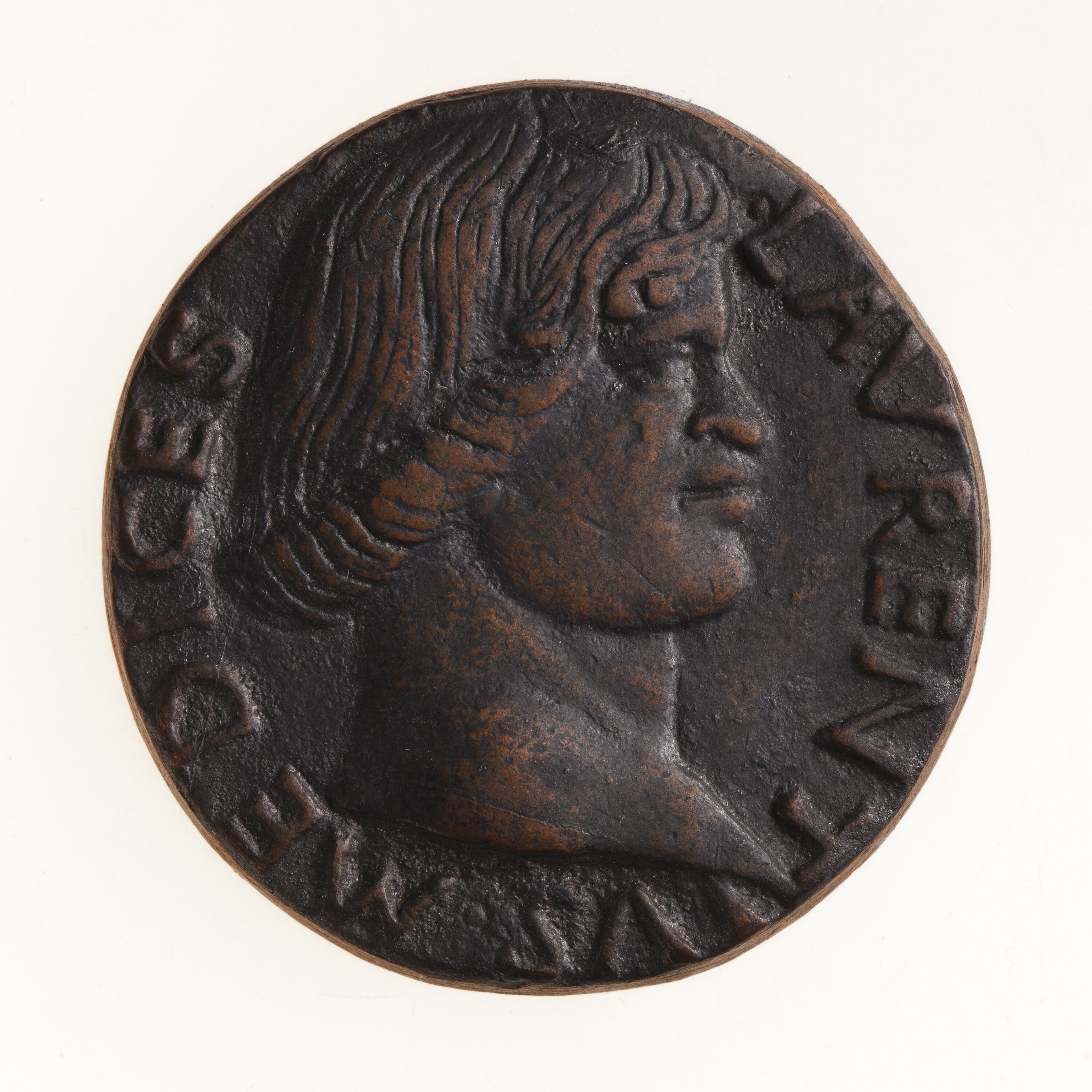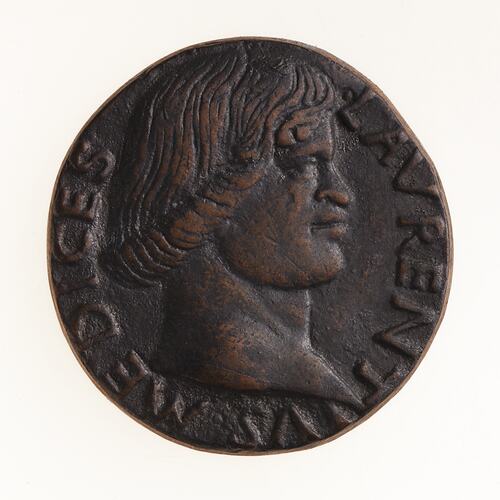 Copy of a medal of Lorenzo de' Medici (1448-1492). The original medal was by the Italian artist Bertoldo di Giovanniin before 1491. This two piece electrotype copy was made circa 1881 by Robert Ready. The original medal was acquired by the British Museum and later exhibited in the King's Library in 1881. It is No. 34 in the catalogue of that exhibition. It is thought that this electrotype was produced in association with that exhibition and publication and acquired by the National Gallery of Victoria where it was displayed in the mid 1880s.