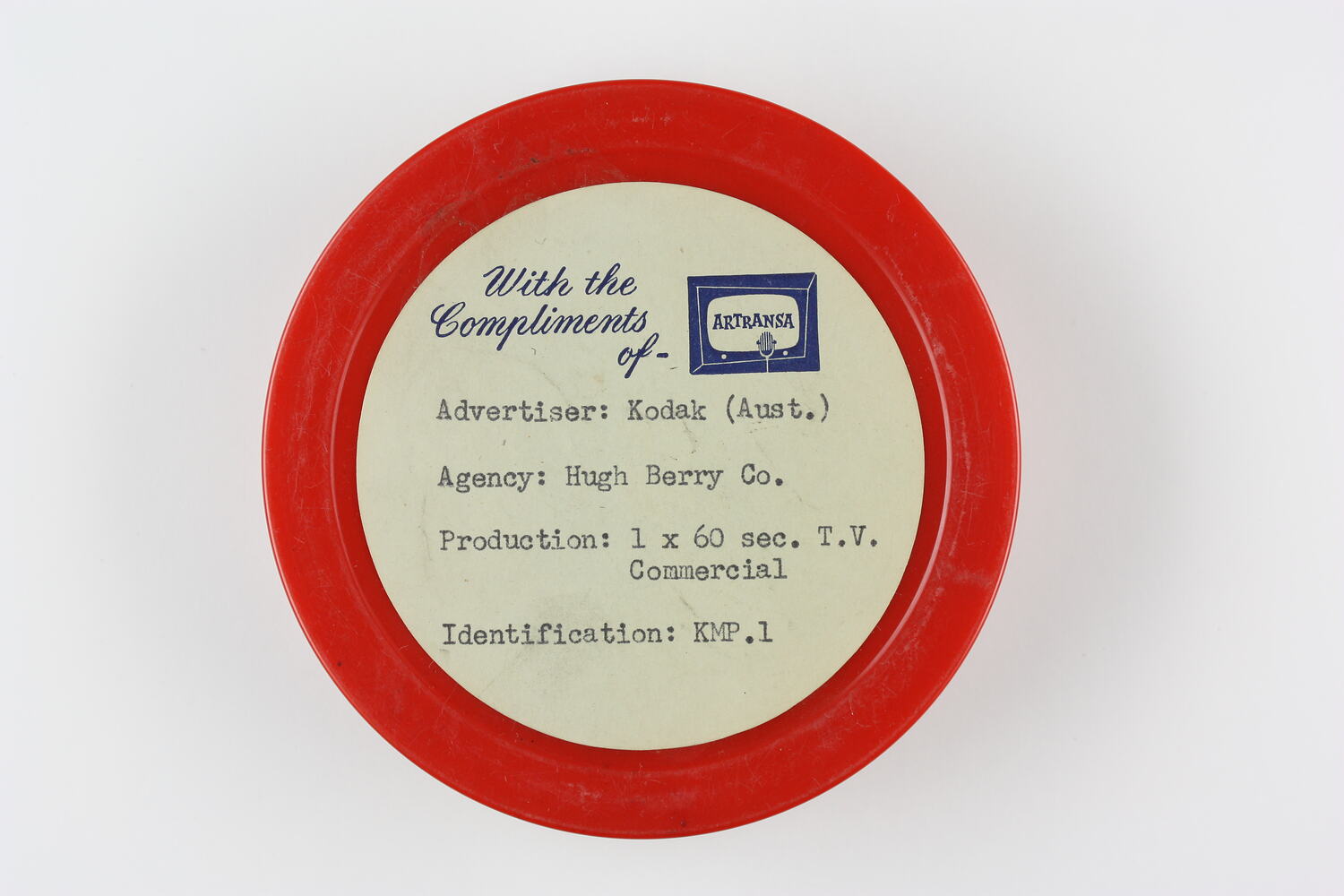 Canister lid, sticker, printed, blue ink: 'With the / Compliments / of- (drawing of a television with 'ARTRANSA' written on the screen)' Canister lid, sticker, typed, black ink: 'Advertiser: Kodak (Aust.) / Agency: Hugh Berry Co. / Production: 1 x 60 sec T.V. / Commercial / Identification: KMP.1.' Reel, embossed: 'ARTRANSA / TV / FILMS'