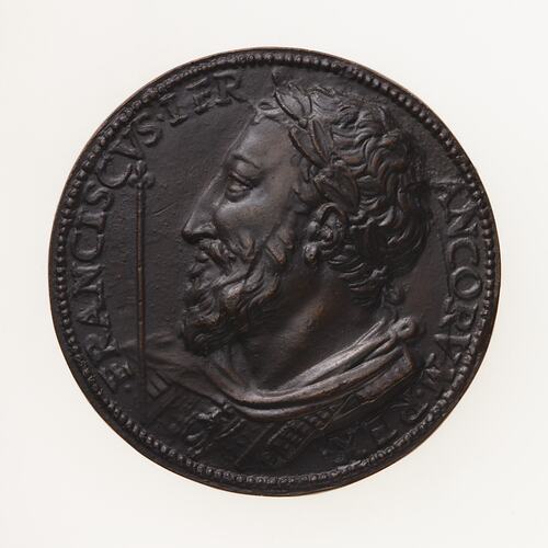Copy of a medal of King Francis (François) I of France. The original medal by Benvenuto Cellini, was cast in about 1537. This two piece electrotype copy was made circa 1881 by Robert Ready.This two piece electrotype copy was made circa 1881 at British Museum by Robert Ready from a bronze held by that museum (Possibly Reg: G3,FrM.73 from the collection of George III).