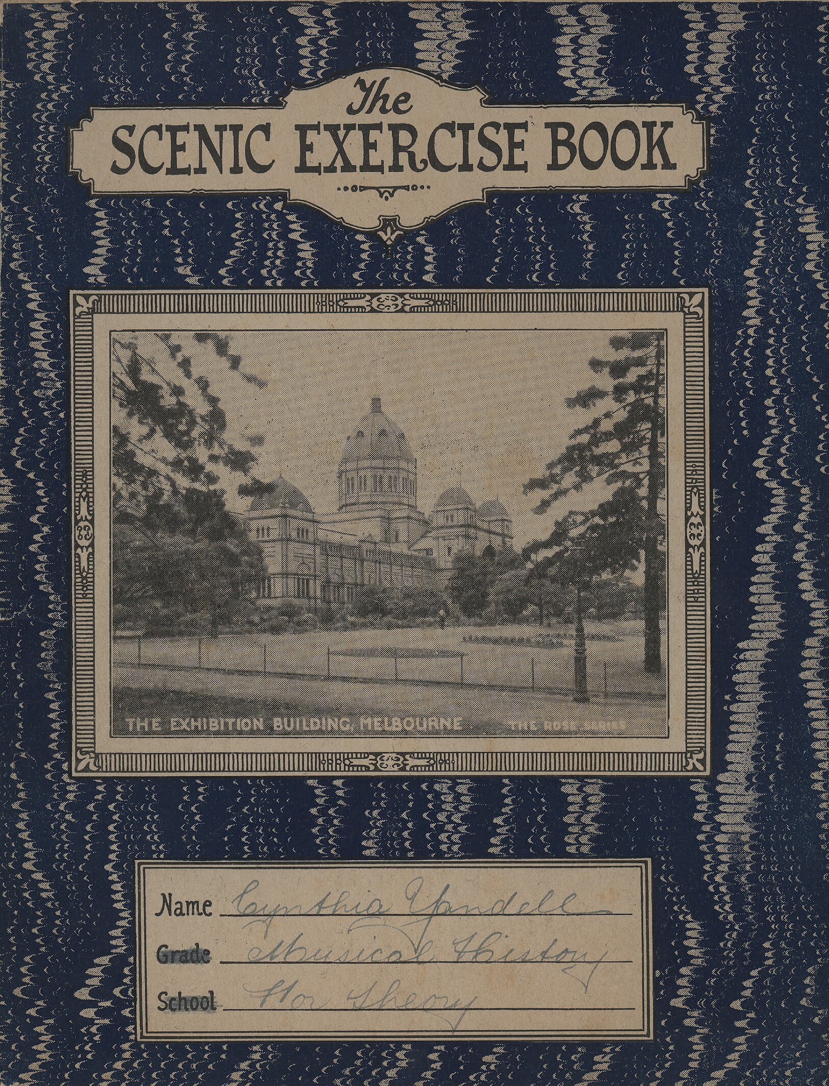 On Obverse: The/ SCENIC EXERCISE BOOK/ THE EXHIBITION BUILDING MELBOURNE. THE ROSE SERIES/ Name Cynthia Yandell/ Grade (crossed out) Musical History/ School (crossed out) &/or Theory