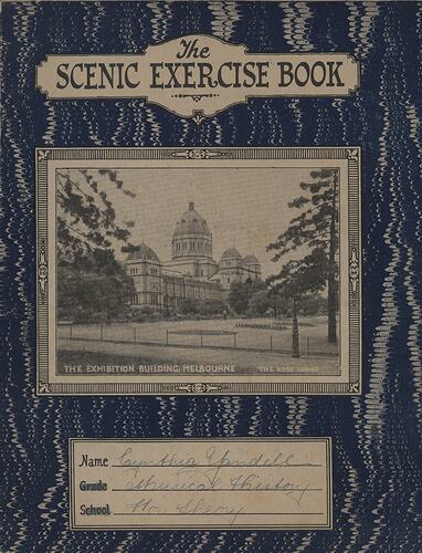 An exercise book from circa 1920 with a Rose photograph of the Exhibition Building, Melbourne, on the front cover. The book was used by Cynthia Yandell for Musical History and/ or Theory. The back cover of the exercise book includes mathematical tables and measurements.