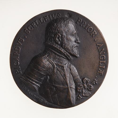 Half-length figure of Richard Shelley facing right with hair short, beard pointed and small ruff wearing armour with a Maltese cross on the breast; scarf tied round left arm; around, RICARDVS . SCELLEIVS . PRIOR . ANGLIAE . AN.A.LXIIII; below bust, BERN. RANTWIC F.