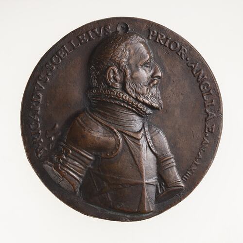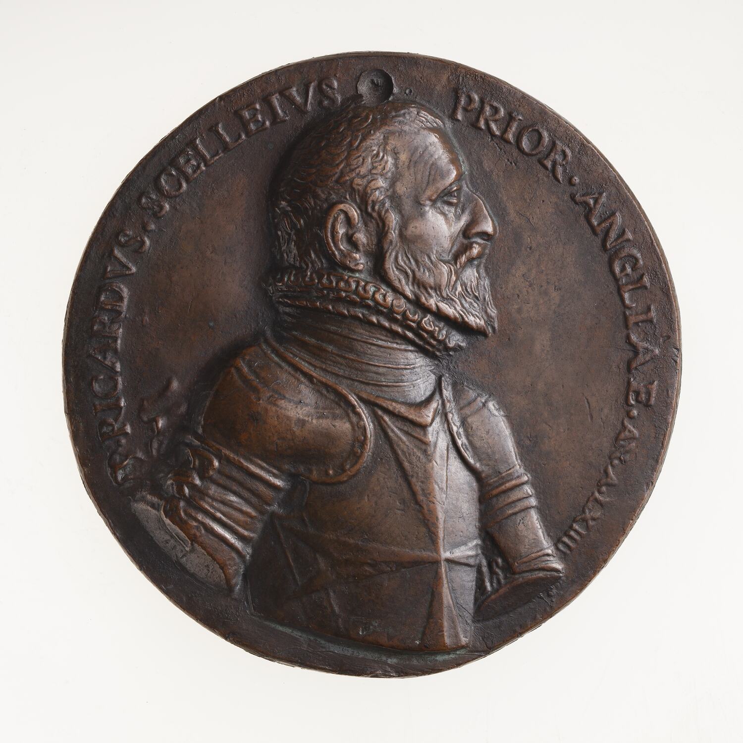 Half-length figure of Richard Shelley facing right with hair short, beard pointed and small ruff wearing armour with a Maltese cross on the breast; scarf tied round left arm; around, RICARDVS . SCELLEIVS . PRIOR . ANGLIAE .; ending in smaller lettering, AN.A.LXIII