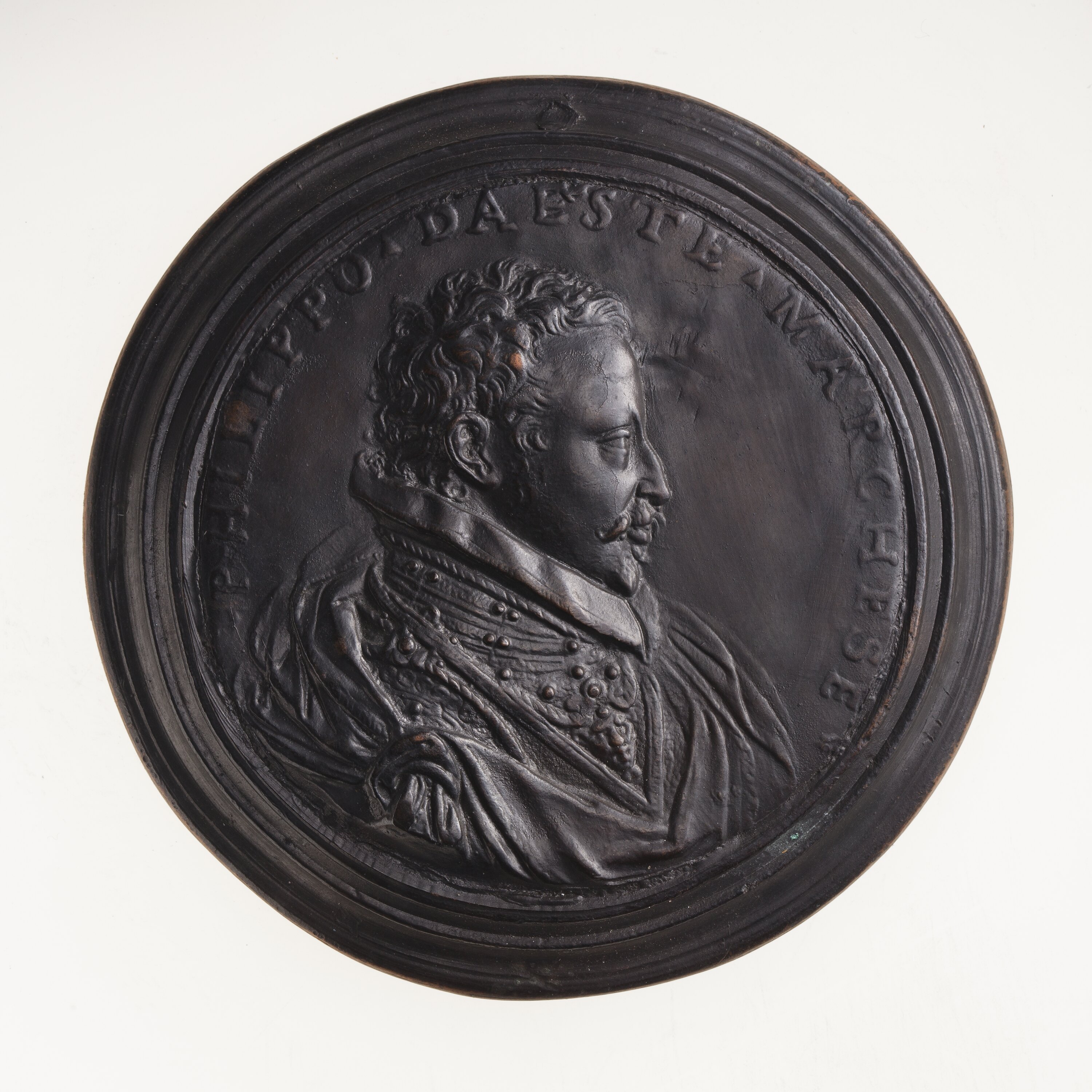Copy of a medal depicting Filippo Marquis d'Este. The original medal by the artist Alessandro Ardenti was cast during the 16th century at Reggio nell'Emilia. This uniface electrotype copy was made circa 1881 by Robert Ready. This electrotype was taken from from a cast lead medal set in a lead frame in the British Museum's collection (Reg. G3,FerrM.19). The electrotype is copper plated and toned.