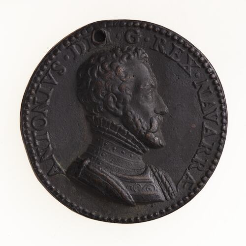 Copy of a medal depicting Antoine de Bourbon, King of Navarre. The original medal by the artist Etienne Delaune was cast in 1559. This two piece electrotype copy was made circa 1881 by Robert Ready. This two piece electrotype copy was made circa 1881 at British Museum by Robert Ready from a cast lead medal in the museum's collection (Reg. M.2064).