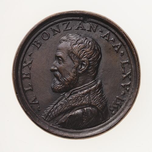 Bust of Alessandro facing left, bearded, wearing a doublet, and a coat with a fur collar; around, . ALEX . BONZAN . A . A . LXV . 1553