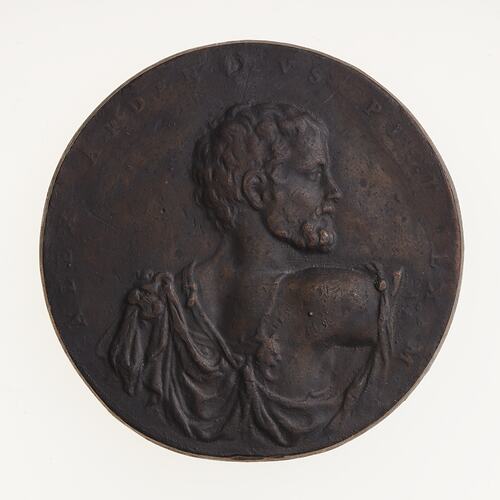 Copy of a medal depicting the painter Alessandro Ardenti. The original medal by Alfonso Ruspagiari was produced in the 16th century (before 1576). This uniface electrotype copy was made circa 1881 by Robert Ready. It is thought that this electrotype was produced in association with an exhibition of medals in the King's Library in 1881 and was acquired by the National Gallery of Victoria where it was displayed probably in the late 1880s.This uniface electrotype is copper plated and toned. The original was a cast lead uniface medal from the collection of King George III in the British Museum collection (Reg. G3,IP.41)