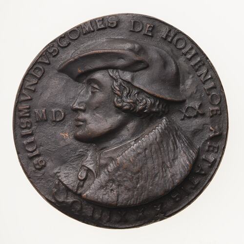 Copy of a medal with a portrait of Sigmund Count Of Hohenlohe, aged 33. The original medal, by an unknown artist, was made in 1520. This uniface electrotype copy made circa 1881 by Robert Ready.