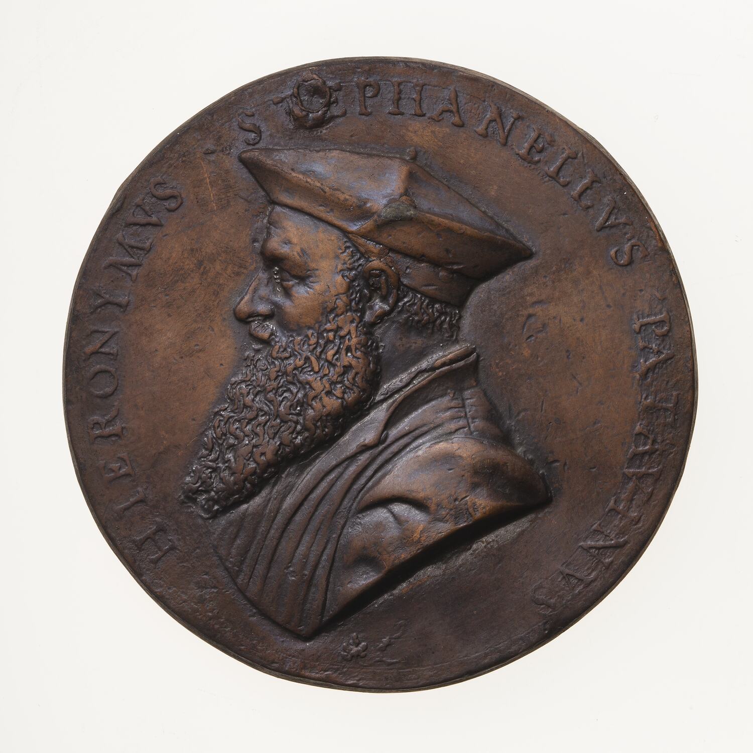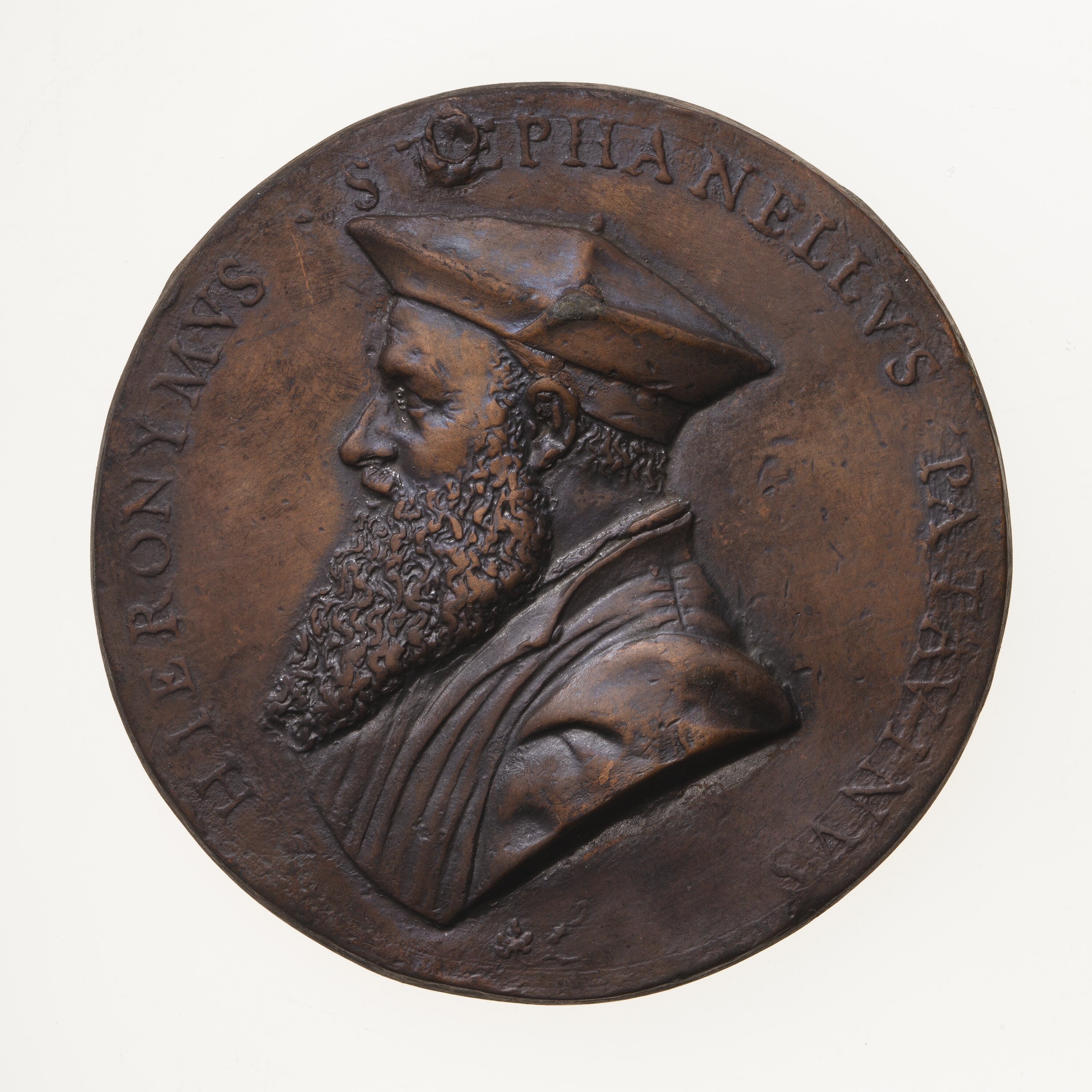 Bust of Girolamo facing left, bearded, wearing a coat and a biretta; around, HIERONIMVS . STEPHANELLVS . PATAVINVS (translation: Girolamo Stefanelli of Padua)