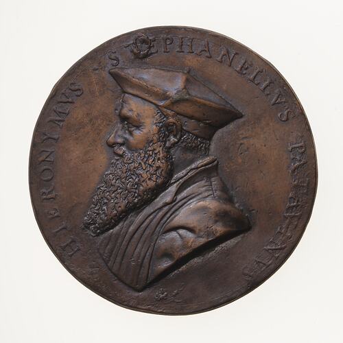Copy of a medal with a portrait of Girolamo Stefanelli of Padua. The original medal, by an unknown artist, was made in the period 1550-1575. This uniface electrotype copy made circa 1881 by Robert Ready. It is thought that this electrotype was produced in association with an exhibition of Italian medals in the King's Library in 1881 (No.299 in the catalogue) and was acquired by the National Gallery of Victoria where it was displayed probably in the late 1880s.This uniface electrotype is copper plated and toned. The original was a cast lead uniface medal from the collection of King George III in the British Museum collection (Reg. G3,IP.960)