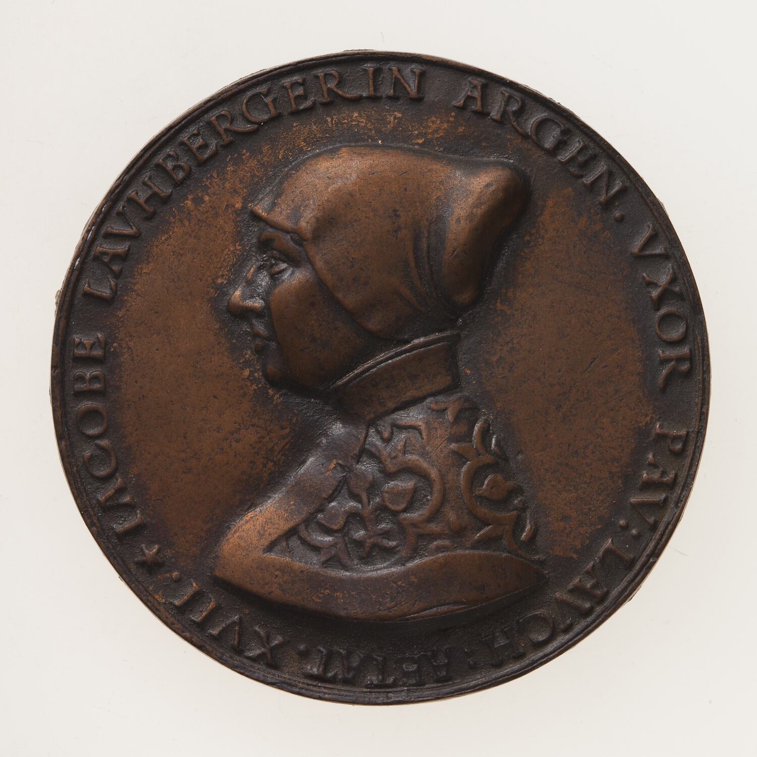 Bust of Iacobe Lauchberger facing left wearing high necked dress and cap; around, * IACOBE LAVHBERGERIN ARGEN. VXOR PAV: LAVCH: AETAT . XVII .