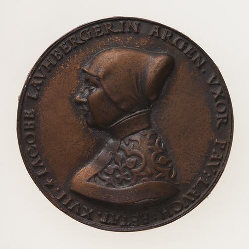 Copy of a medal depicting Iacobe Lauchberger aged 17. The original medal by Friedrich Hagenauer in Strassburg in about 1532. This uniface electrotype copy was made circa 1881 by Robert Ready.