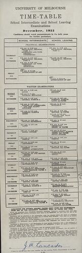 On obverse: UNIVERSITY OF MELBOURNE/ TIME-TABLE/ School Intermediate and School Leaving/ Examination/ December, 1953/ Candidates should watch in the daily press/ for further particulars.