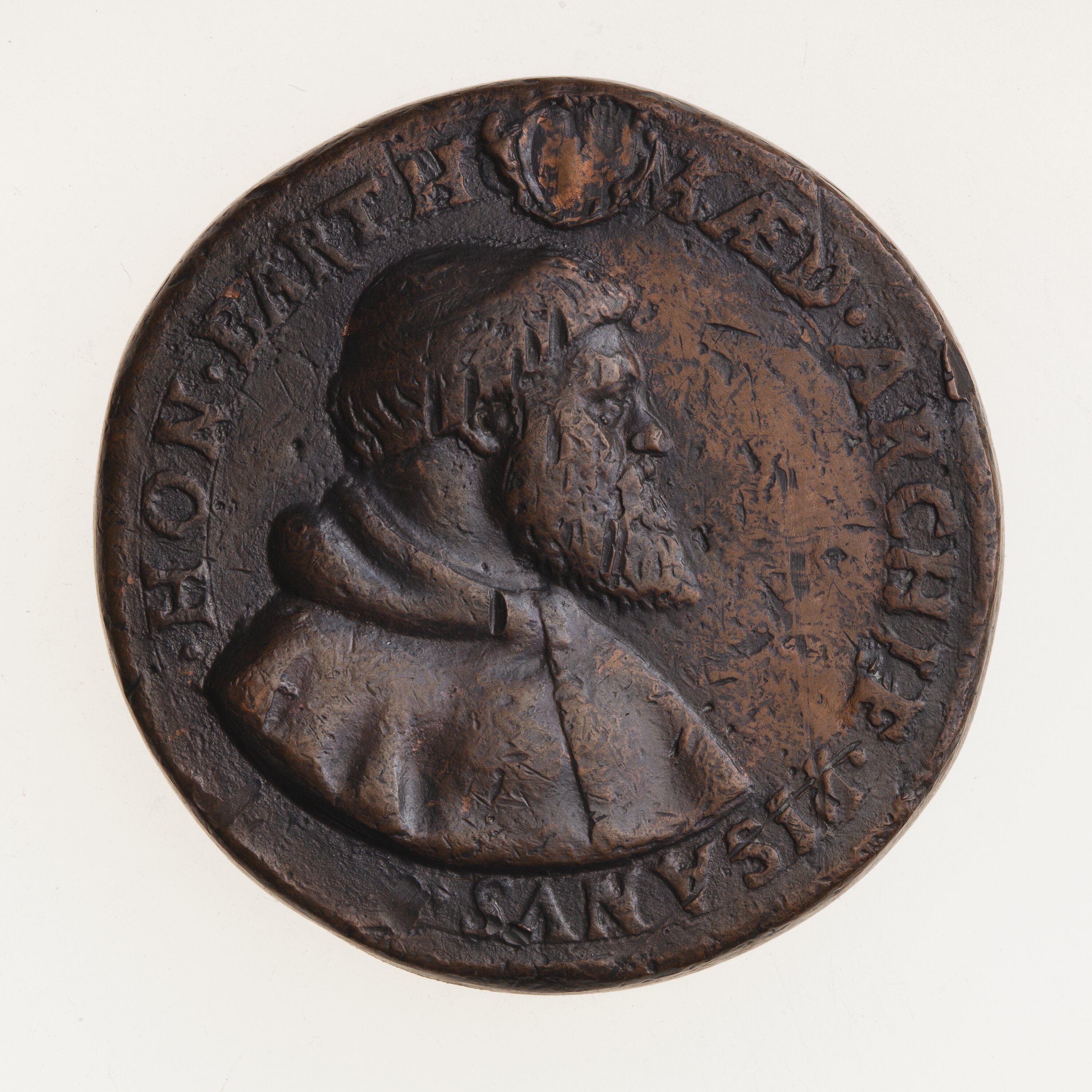 Bust of Onofrio facing right, bearded, tonsured, wearing a hooded cassock; around, . HON . BARTH[O .] MAED . ARCHIE . PISANVS .