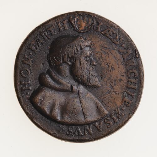 Copy of a medal bearing a portrait of Archbishop Onofrio Bartolini de' Medici of Pisa (1493-1521). The original medal, by Giovanni Zacchi of Bologna, was made in about 1500. This two piece electrotype copy was made circa 1881 by Robert Ready. It is thought that this electrotype was produced in association with an exhibition of medals in the King's Library in 1881 and was acquired by the National Gallery of Victoria where it was displayed probably in the late 1880s.This two sided electrotype is copper plated and toned. The original was a lead cast two sided medal in the British Museum collection (Reg: M.8860).