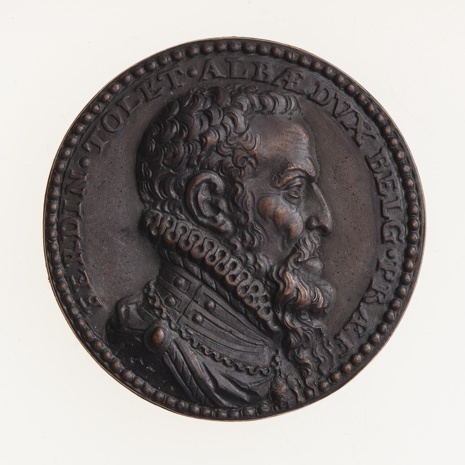 Bust of Ferdinand facing right, bearded, wearing armour and ruff; around, FERDIN . TOLET . ALBÆ DVX BELG . PRÆF; incuse on bust truncation, 1571 .