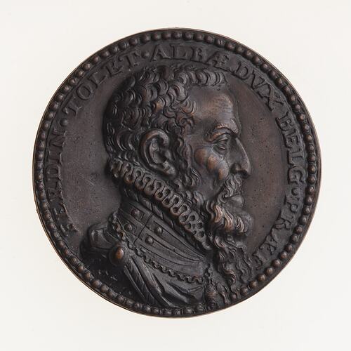 Copy of a medal bearing a portrait of Fernando Álvarez de Toledo. The original medal, by Jacques Jonghelinck, was made in 1571. This uniface electrotype copy was made circa 1881 by Robert Ready. The original cast silver medal was part of the British Museum collection (Reg: M.2014 or M.2015). It is thought that this electrotype was produced in association with an exhibition and was acquired by the National Gallery of Victoria where it was displayed probably from the late 1880s.The electrotype is copper plated and toned (in error, it should be silver plated).