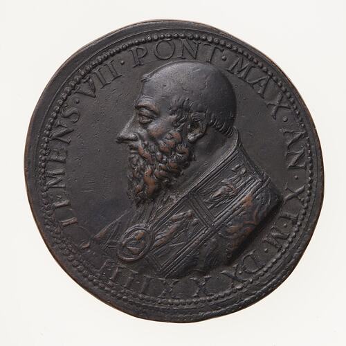 Copy of the obverse of a medal bearing a portrait of Pope Clement VII (1523-1534). The original medal, by Benvenuto Cellini was struck in 1534. This uniface electrotype copy was made circa 1881 by Robert Ready. Electrotype taken from a medal struck from the same obverse die as one exhibited in the King's Library of the British Museum in 1881, No. 86 in the catalogue of that exhibition. The original medal for this piece (which is copper plated and toned) is unknown.