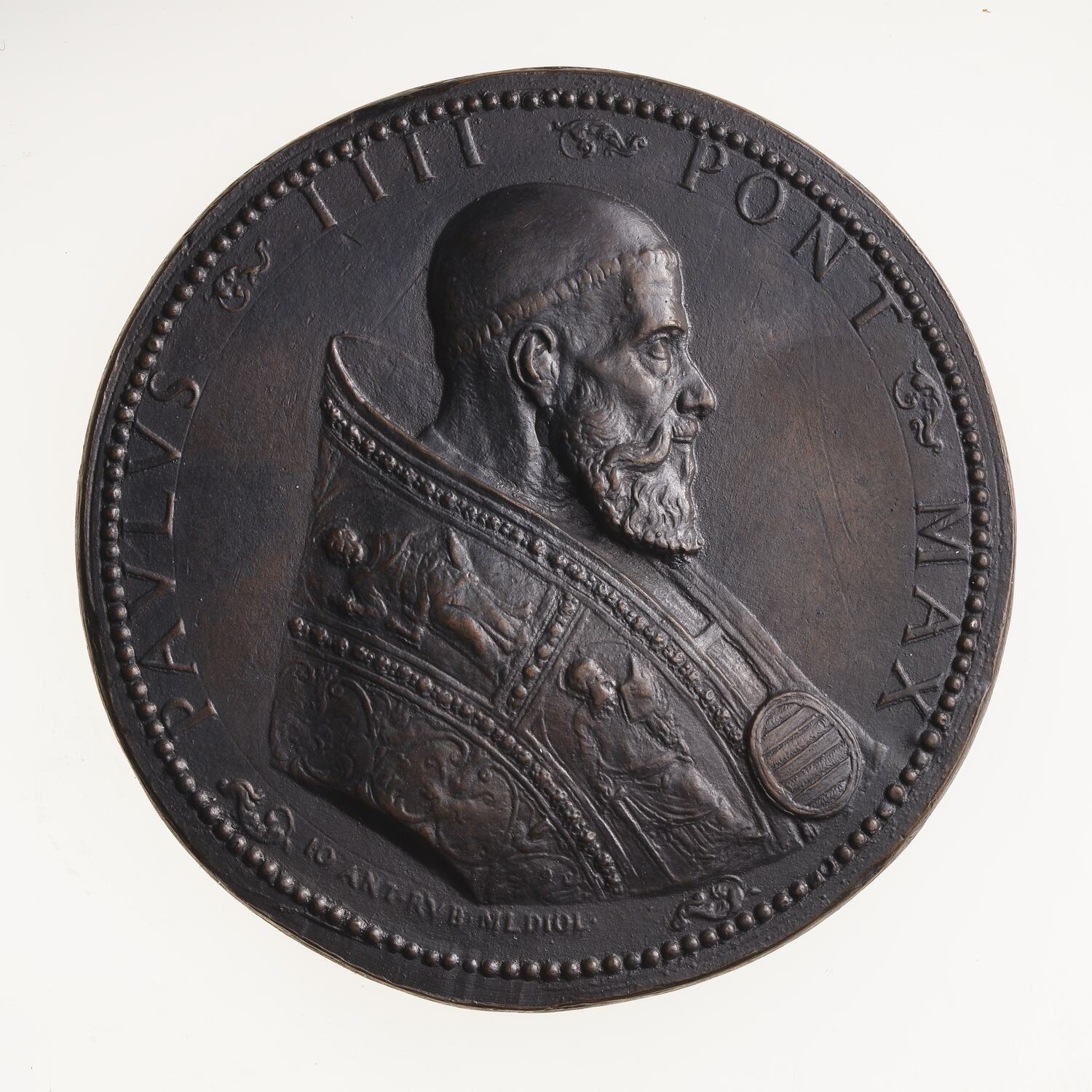 Copy of a medal bearing a portrait of Pope Paul IV (1555-1569). The original medal, by Giovanni Antonio de' Rossi was made in 1556. This two piece electrotype copy was made circa 1881 by Robert Ready. The original medal was exhibited in the King's Library of the British Museum in 1881 and is No. 196 in the catalogue of that exhibition. It is thought that this electrotype was produced in association with that exhibition and publication and acquired by the National Gallery of Victoria where it was displayed in the late 1880s. The original medal is cast bronze the electrotype copper plated and toned.