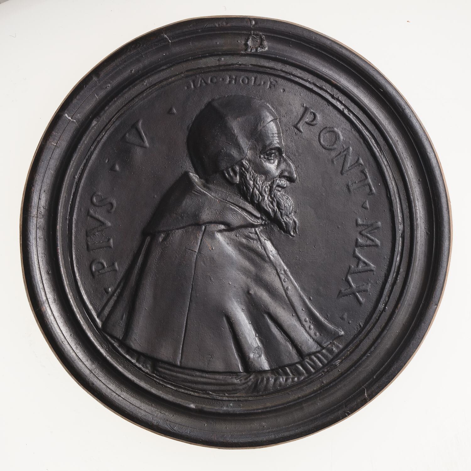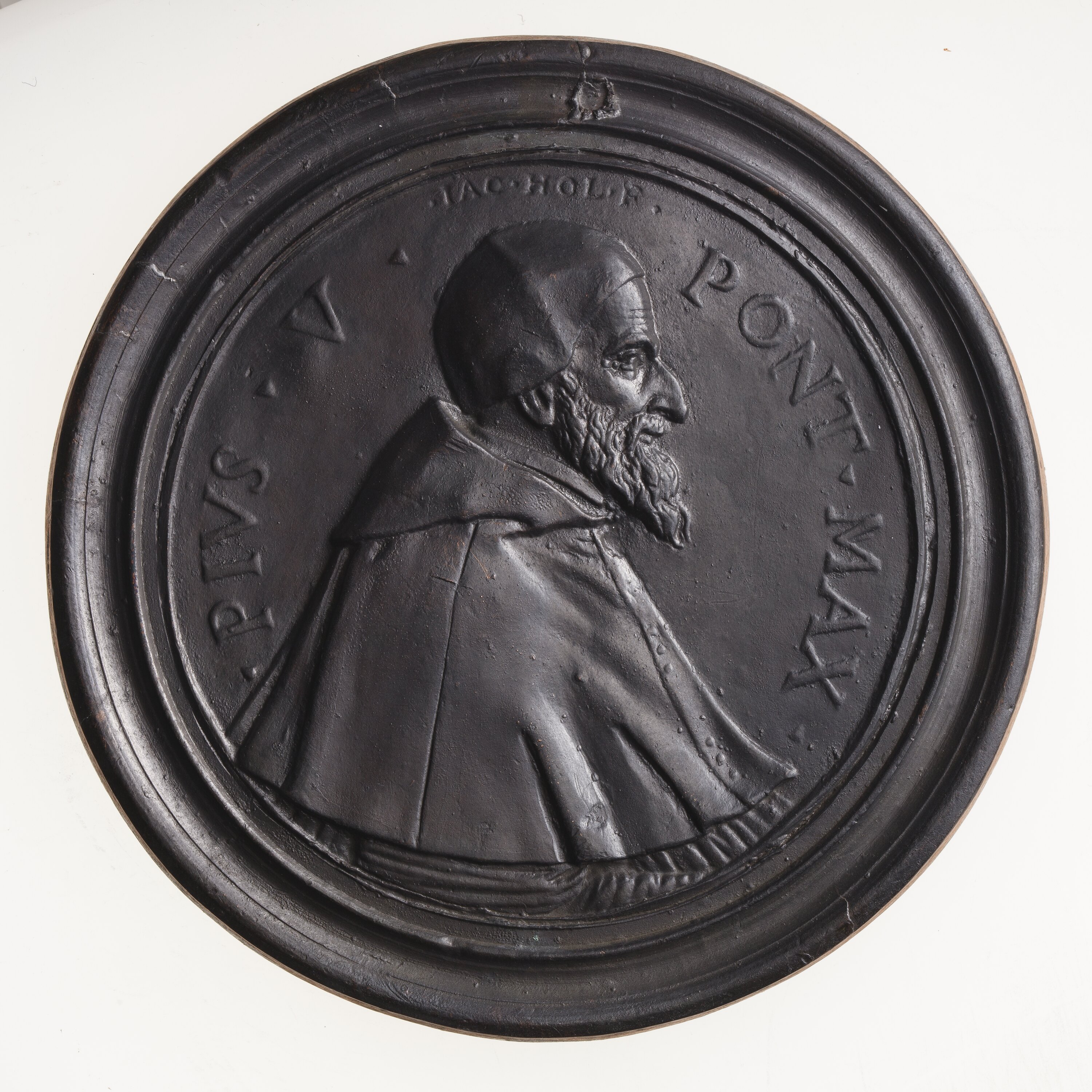 Bust of Pius V facing right in Papal robes and cap; around, . PIVS . V . PONT . MAX .; above head incuse in small lettering, IAC . HOL . F.