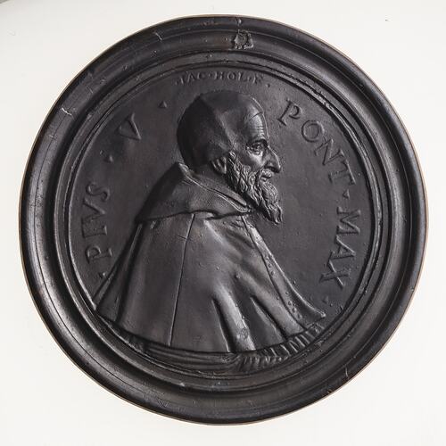 Copy of a medal bearing a portrait of Pope Pius V (1566-1572). The original medal, by IAC. HOL. was cast in about 1570. This uniface electrotype copy was made circa 1881 by Robert Ready. The original medal was exhibited in the King's Library of the British Museum in 1881 and is No. 325 in the catalogue of that exhibition. It is thought that this electrotype was produced in association with that exhibition and publication and acquired by the National Gallery of Victoria where it was displayed in the late 1880s. The original medal is cast lead the electrotype copper plated and toned.