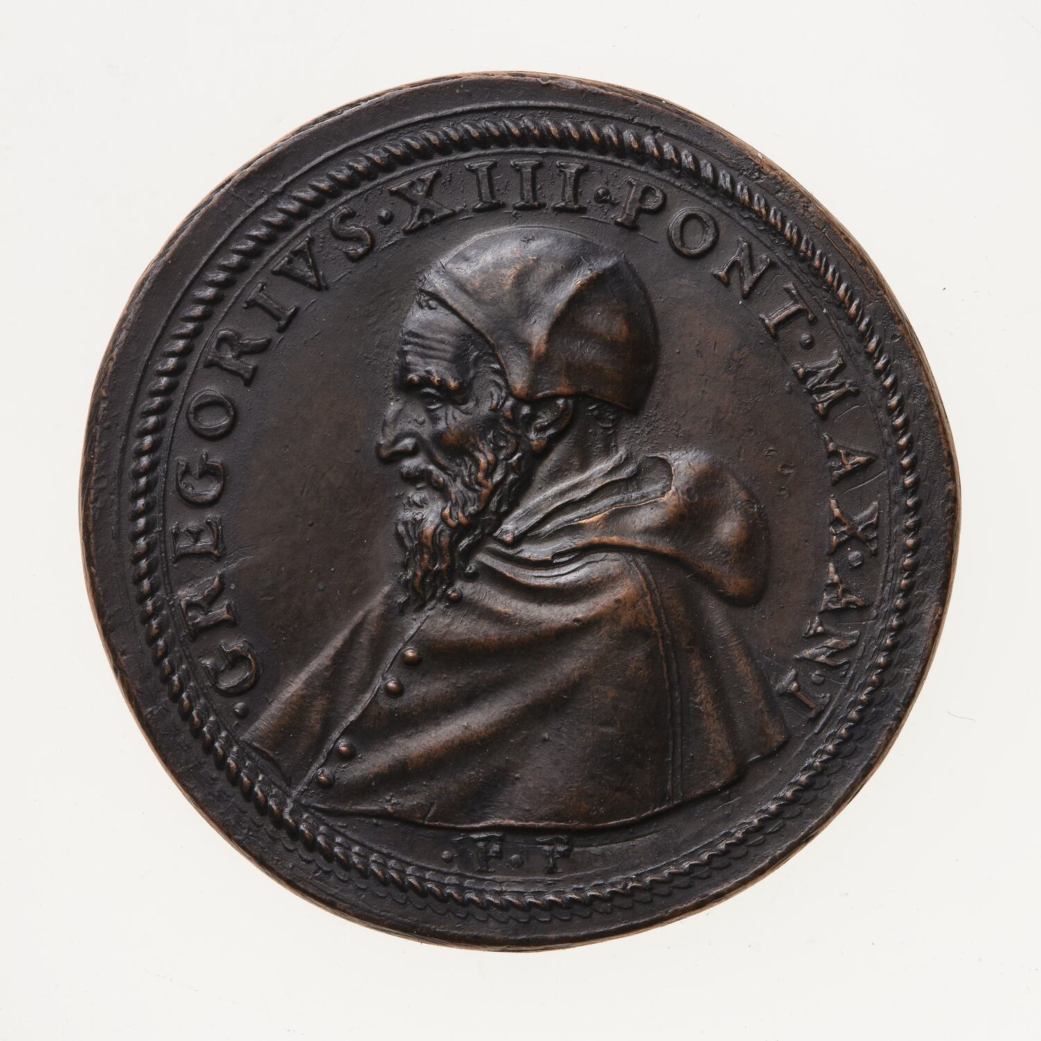 Bust of Gregory XIII facing left in cape and skull-cap; around, . GREGORIVS . XIII . PONT . MAX . AN . I; below bust, . F . P .