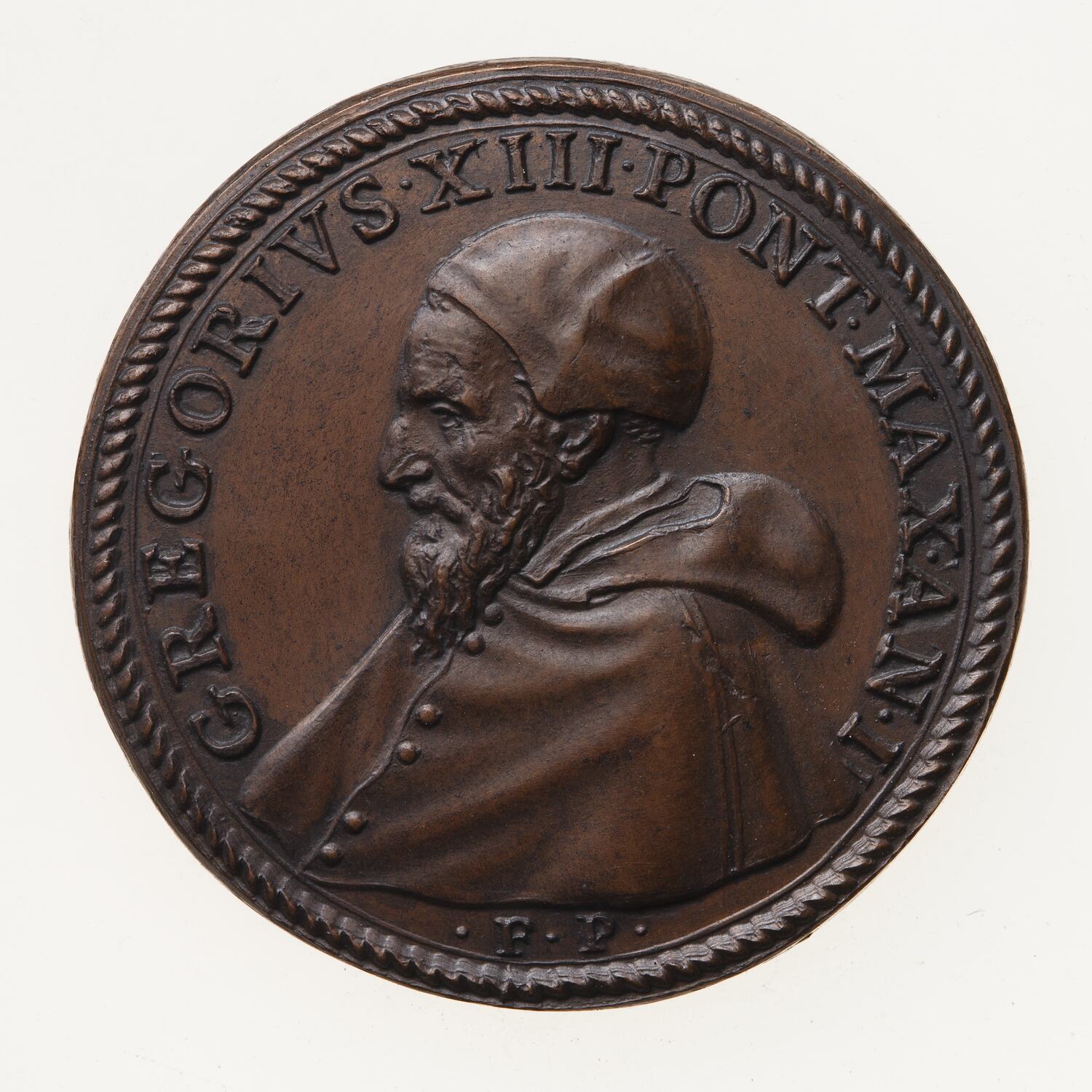 Bust of Gregory XIII facing left in cape and skull-cap; around, . GREGORIVS . XIII . PONT . MAX . AN . I; below bust, . F . P .