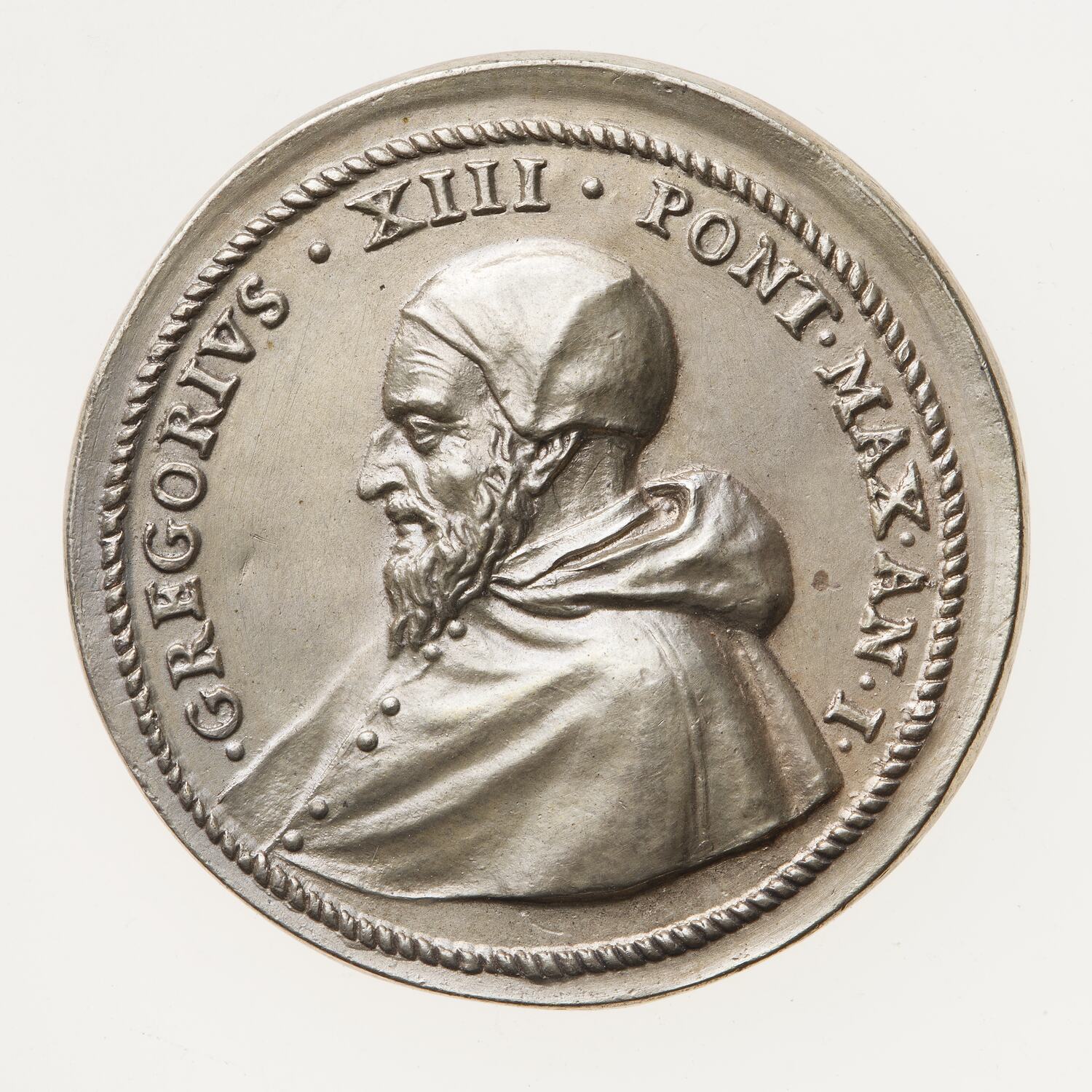 Bust of Gregory XIII facing left in cape and skull-cap; around, . GREGORIVS . XIII . PONT . MAX . AN . I