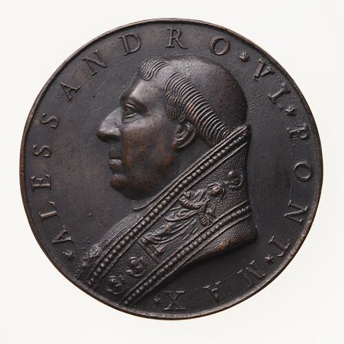 Bust of AlexanderVI facing left in Papal robes, head bare; around, ALESSANDRO . VI . PONT . MAX .