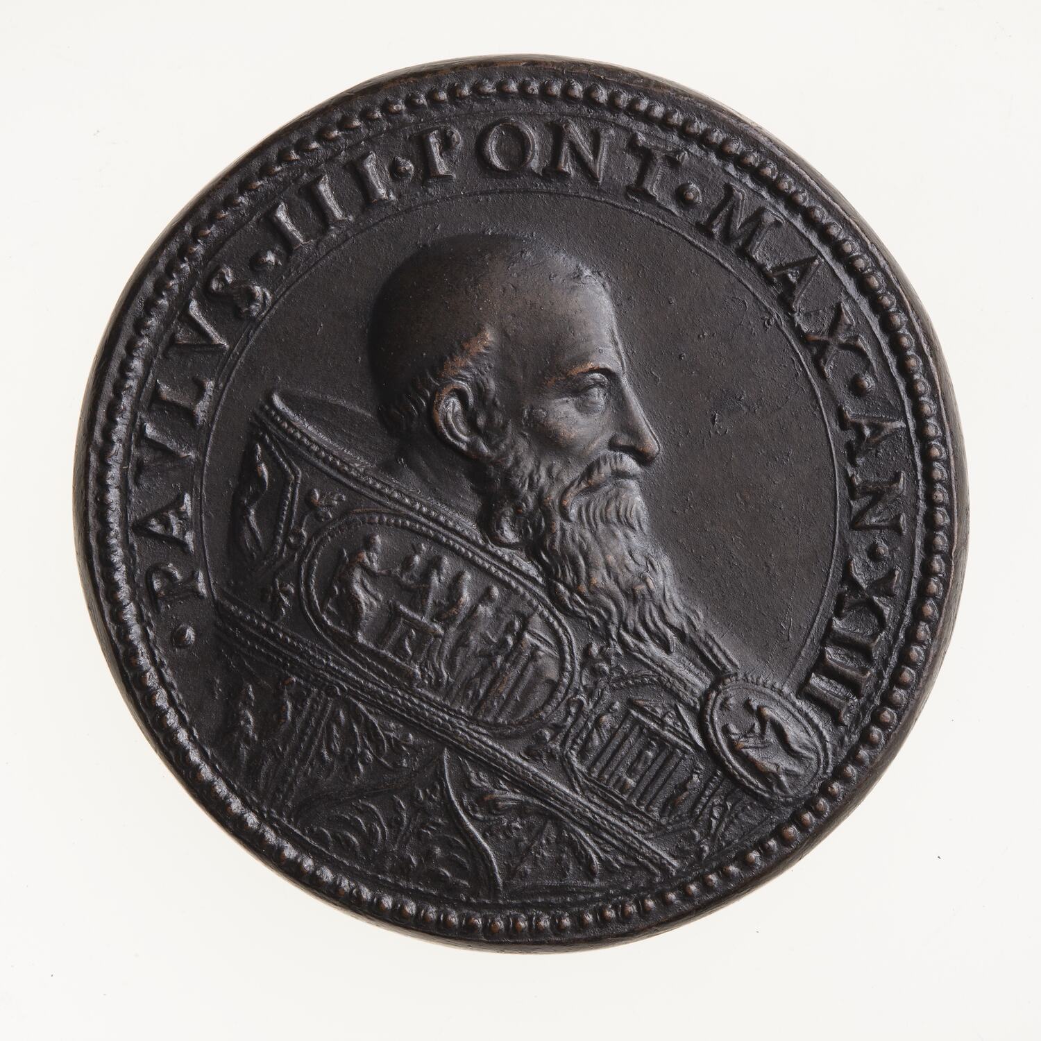 Bust of Paul III facing right in Papal robes, head bare; around, . PAVLVS . III . PONT . MAX . AN . XIII