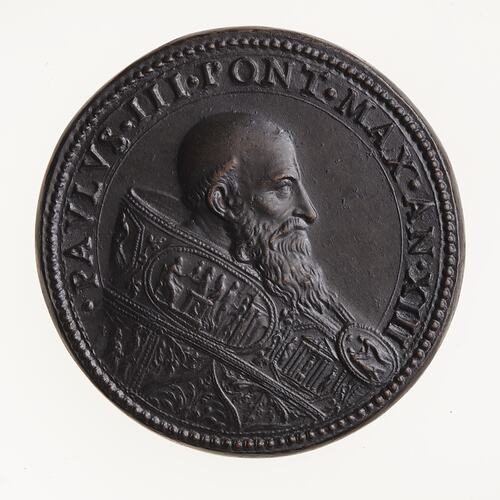 Copy of a medal bearing a portrait of Pope Paul III (1534-1550). The original medal, attributed to Alessandro Cesati (Il Greco), was struck in 1547. This two piece electrotype copy was made circa 1881 by Robert Ready. Electrotype taken from a medal from the collection of George III (British Museum Reg: G3,PMAE5.51) exhibited in the King's Library of the British Museum in 1881, No. 86 in the catalogue of that exhibition. The original medal is struck bronze, this piece is copper plated and toned.