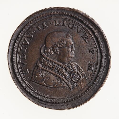 Copy of a medal bearing a portrait of Pope Julius II (1503-1513). The original medal, possibly by Francesco Raibolini (Francia the Painter) or Pier Maria Serbaldi da Pescia, was struck in 1505 or 1506. This two piece electrotype copy was made circa 1881 by Robert Ready. Electrotype taken from a medal exhibited in the King's Library of the British Museum in 1881, No. 76 in the catalogue of that exhibition. The original medal is struck bronze, this piece is copper plated and toned.
