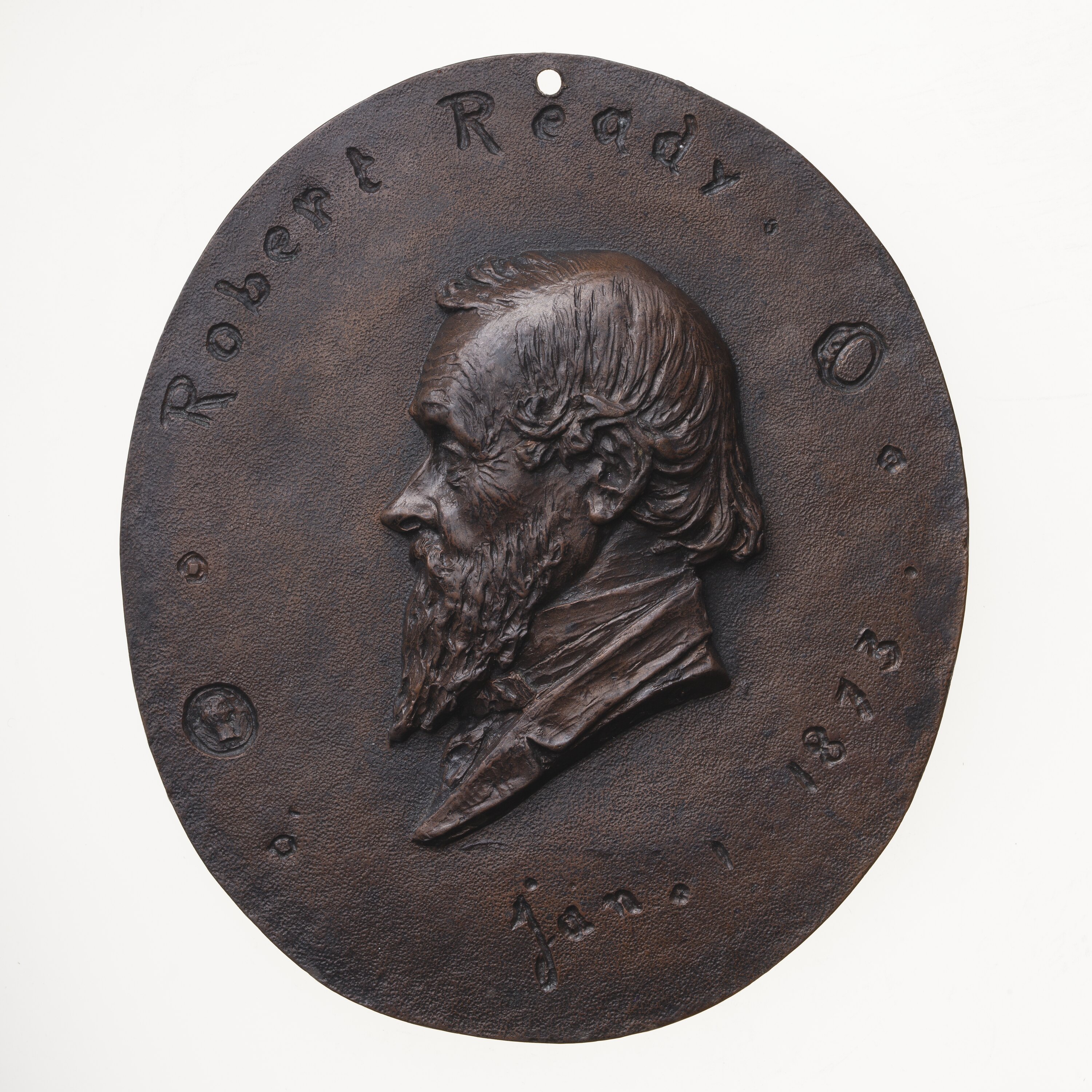 Bust facing left wearing coat and tie; around above (incuse), Robert Ready; around below (incuse) Jan.1 1873