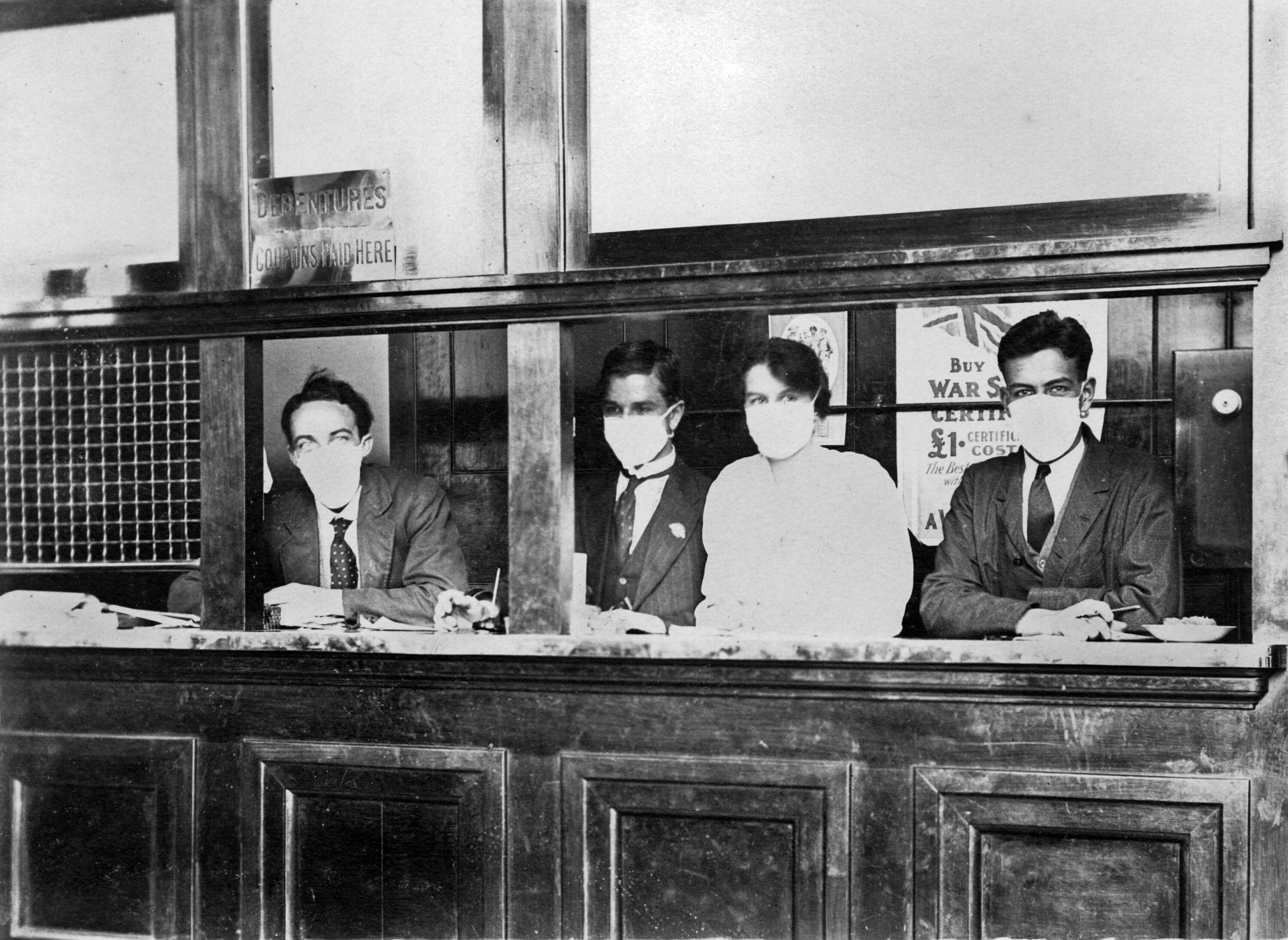 Four bank tellers wearing face masks during the 1919 influenza pandemic.