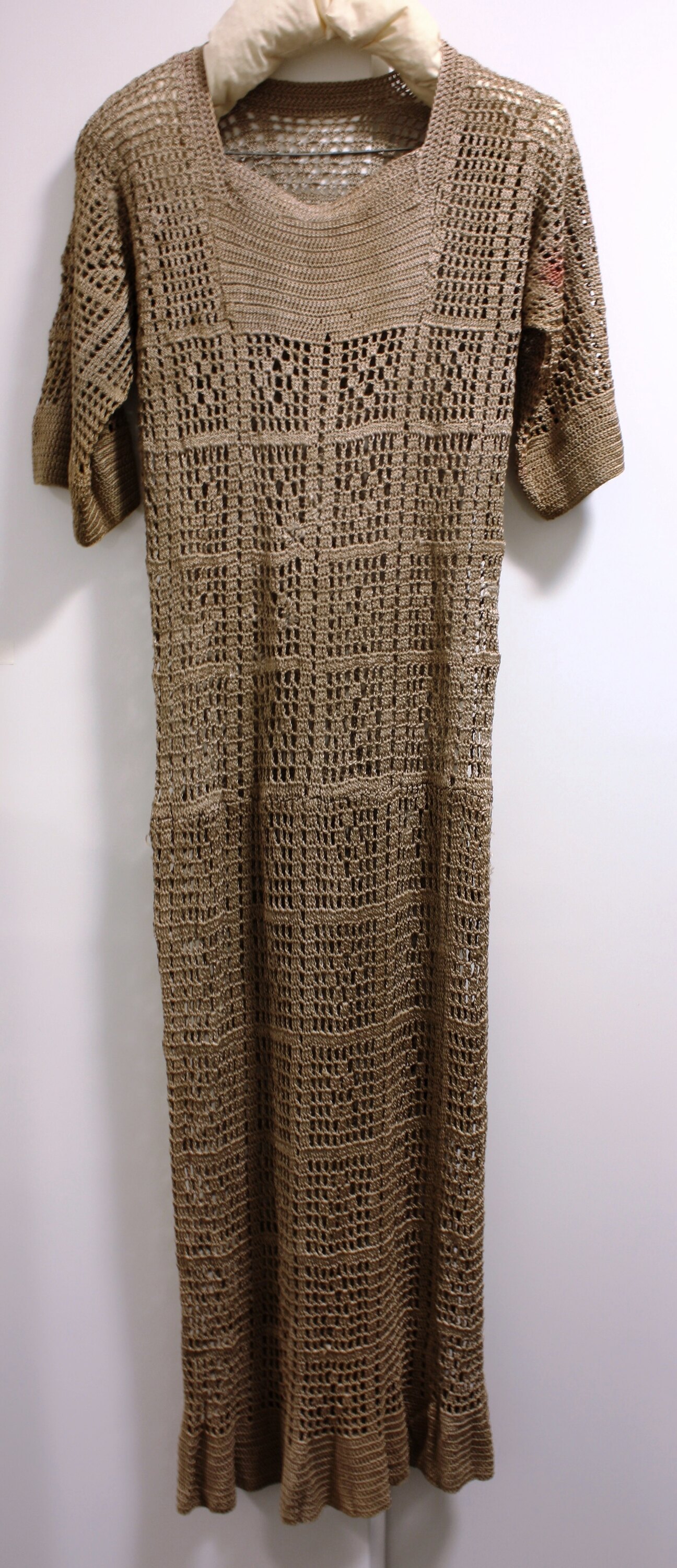Fawn-coloured crochet dress. Square neckline; short sleeves; ankle length. Fluted at hem. Pink stain on proper left sleeve.