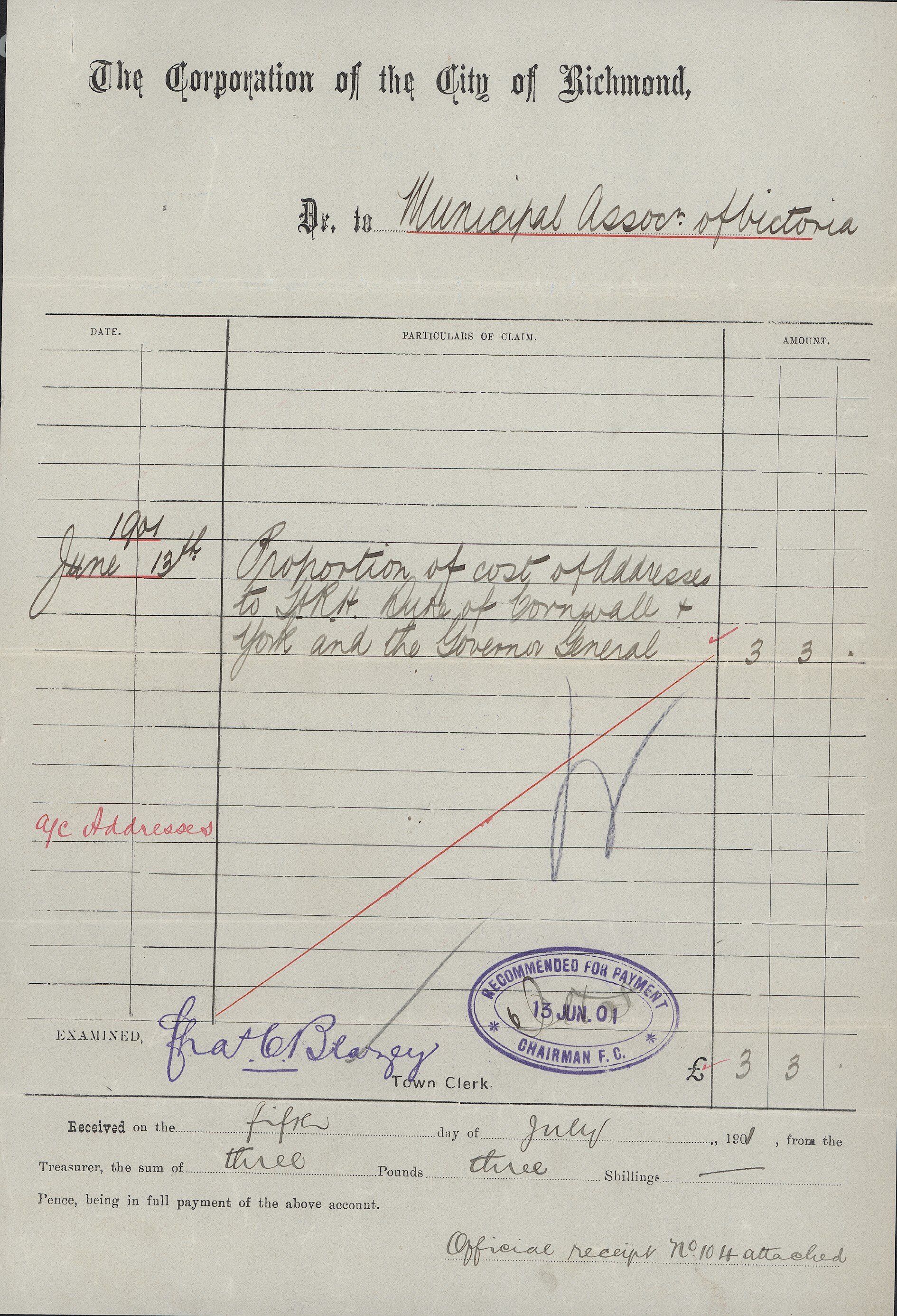 The Corporation of the City of Richmond, / Dv. to [handwritten]Municipal Assoc. of Victoria./ DATE./[handwritten] 1901/ June 13th / a/c ADDRESSES / PARTICULARS OF CLAIM / [handwritten] Proportions of cost of Addresses to H.R.H.Duke of Cornwall + York and the Governor General/ AMOUNT / 3.3 /examined [signed] [illeg] C. Blazey/ Town Clerk/ £3.3./ [bottom of page under line]Received on the fifth day of July., 1901, from the Treasurer, the sum of Three Pounds three Shillings-/Pence, being in full payment of the above amount./ [handwritten] Official receipt no.104 attached