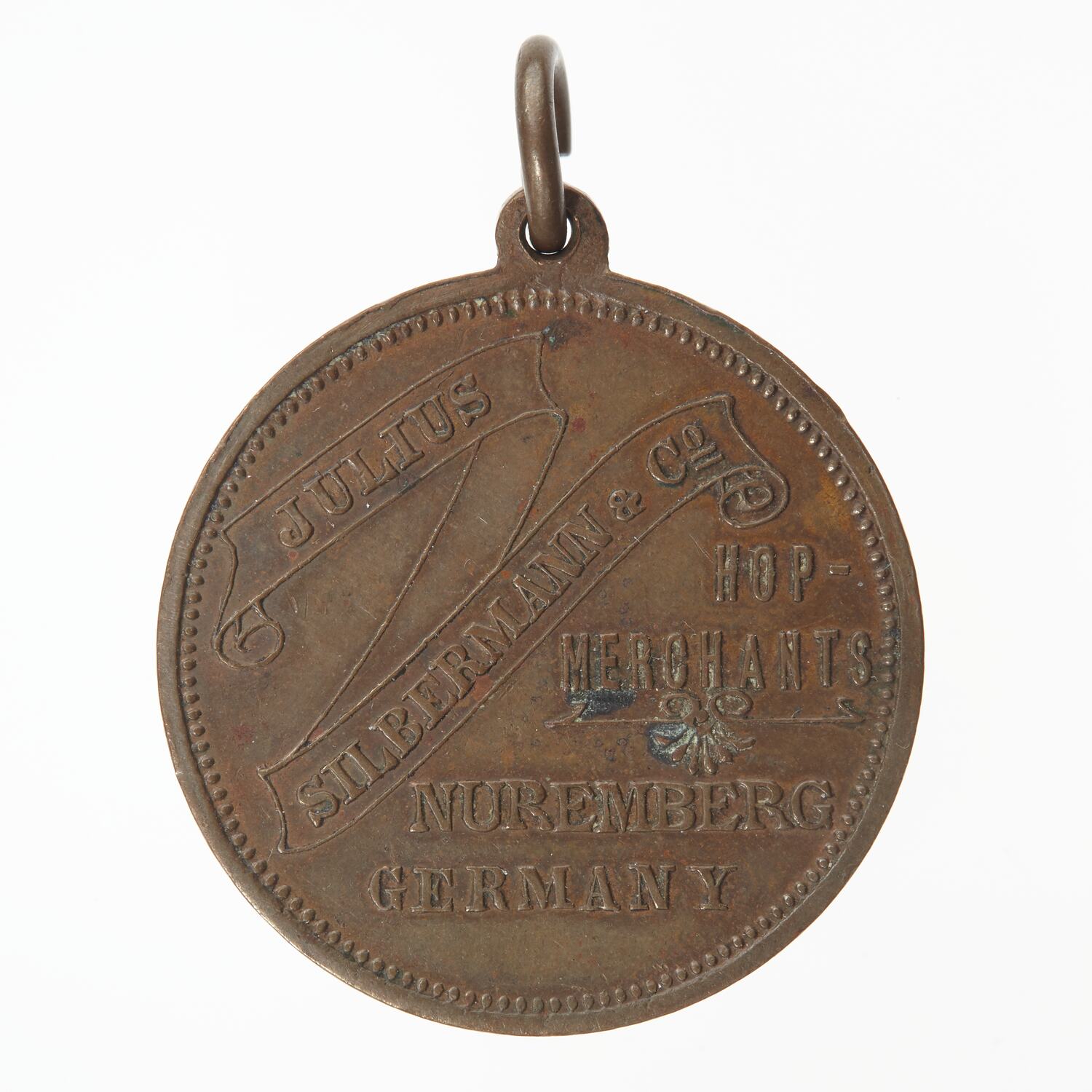 Ribbon banner diagonally across upper left half of medal inscribed with the company name: JULIUS/ SILBERMANN & CO. The left hand side of the medal inscribed with further text: HOP/ MERCHANTS/ NUREMBERG/ GERMANY