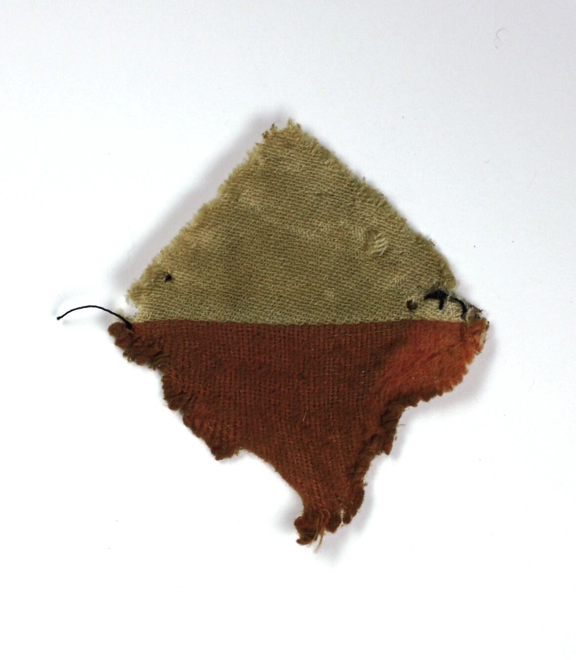 Cloth patch, off-white and pink/orange - faded from original white and red. Comprises two pieces of material, stitched together. The seams are folded back on the underside. Edges frayed and curled, particularly pink section. Losses and scuffing suggest the badge was subjected to battlefield conditions. Remnants of black thread, perhaps used to attach the patch previously.
