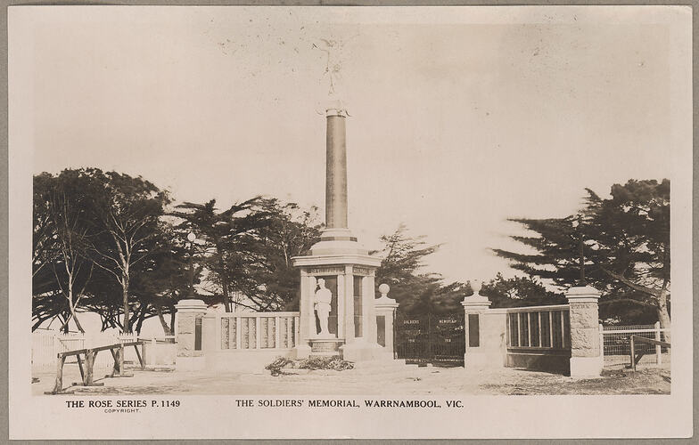 Printed on the bottom of the postcard; 'THE ROSE SERIES P. 1149 / COPYRIGHT / THE SOLDIERS' MEMORIAL, WARRNAMBOOL, VIC.'