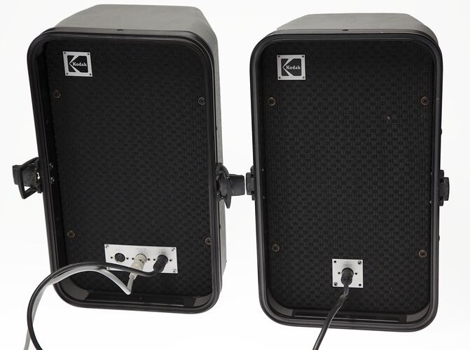 This speaker system is part of the Kodak collection of products, promotional materials, photographs and working life artefacts collected from Kodak Australasia in 2005, when the Melbourne manufacturing plant at Coburg closed down.