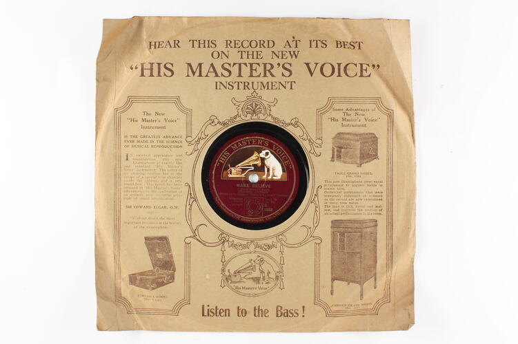 Side A: "His Master's Voice" / "WHY DO I LOVE YOU? / ("SHOW BOAT" - KERN) / Edward O'Henry / (Played on the Organ of "Madame Tussaud's" Cinema) / WURLITZER ORGAN / (2-9409) / Speed 78 / Cat. No. B. 2862 / Record manufactured by THE GRAMOPHONE CO., LTD.,Sydney.N.S.W. Side B: "HIS MASTER'S VOICE" / MAKE BELIEVE / ("SHOW BOAT" - KERN) / Edward O'Henry / (Played on the Organ of "Madame Tussaud's" Cinema) / WURLITZER ORGAN / (2-9409) / Speed 78 / Cat. No. B. 2862 / Record manufactured by THE GRAMOPHONE CO., LTD.,Sydney.N.S.W. Record manufactured by THE GRAMOPHONE CO., LTD.,Sydney.N.S.W. One Side of Sleeve: "HIS MASTER'S VOICE" RECORD / [text and illustrations] Second Side of Sleeve: HOW TO GET THE BEST RESULTS FROM "HIS MASTER'S VOICE" PRODUCTS / [text and illustrations]